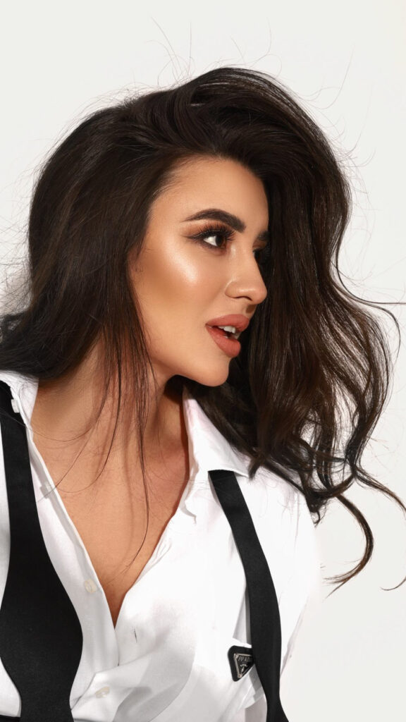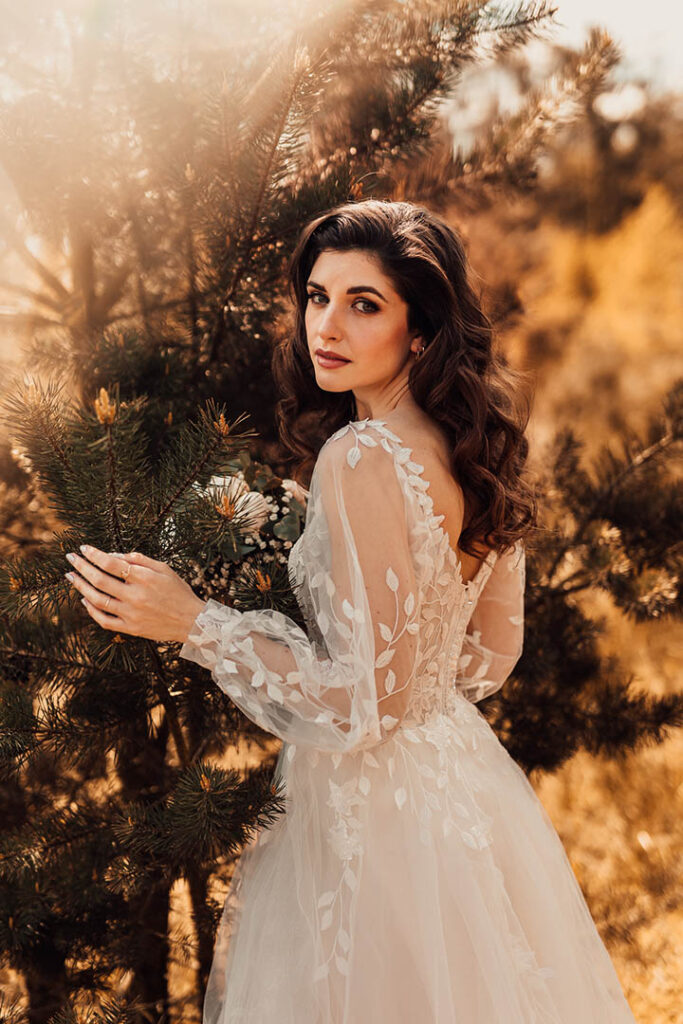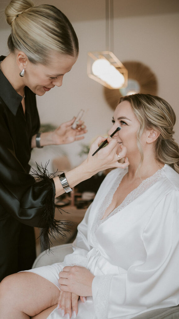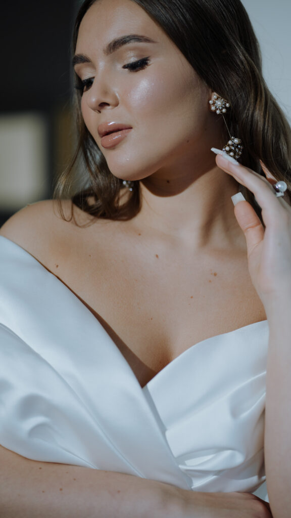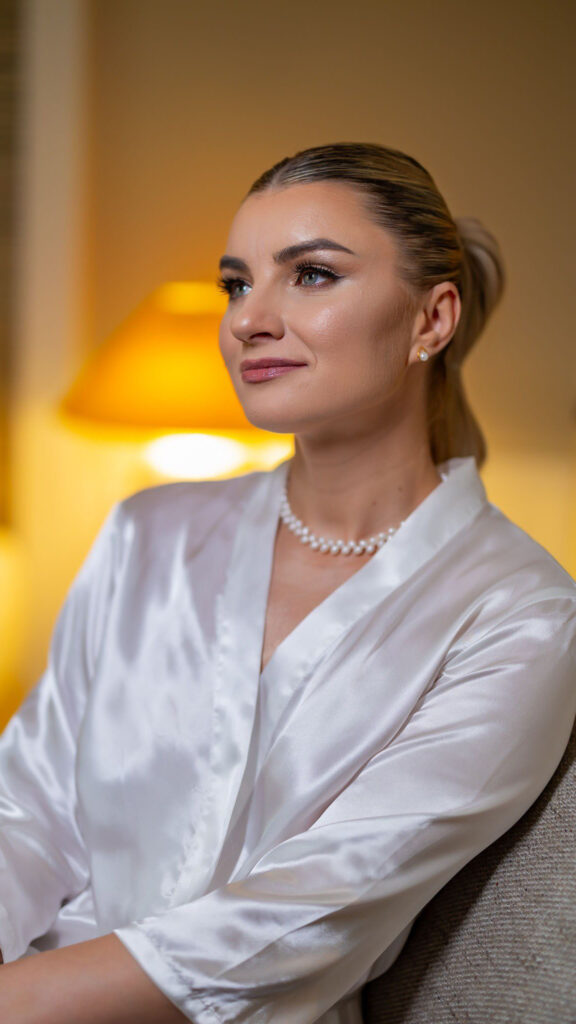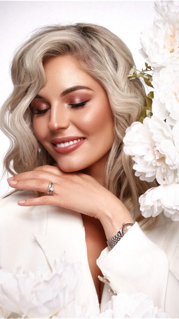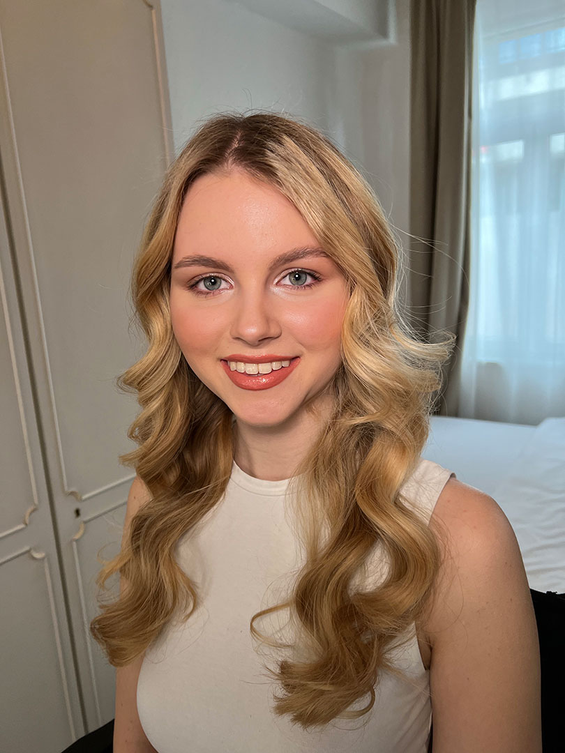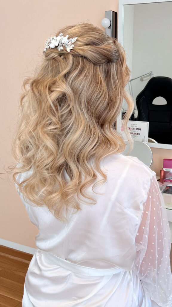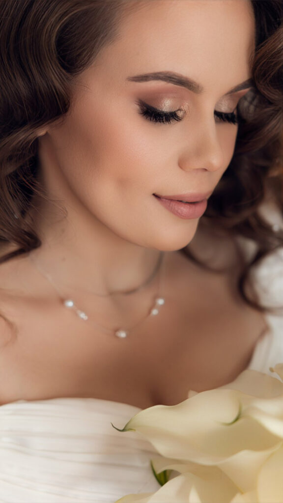 Inklusive professionellem Make-up und Styling, Wimpern, Unterstützung beim Anbringen von Schleier und Accessoires sowie Gestaltung des Dekolleté-Bereichs.