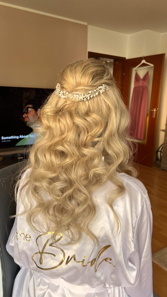 Umfasst Make-up und Frisur, Wimpern, Anprobe des Schleiers und vollständiges Styling wie am Hochzeitstag.